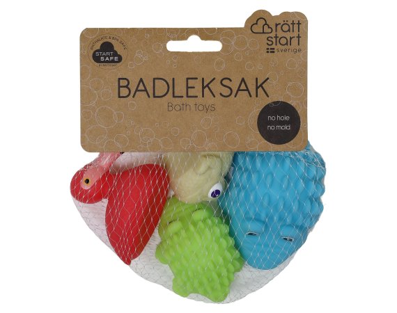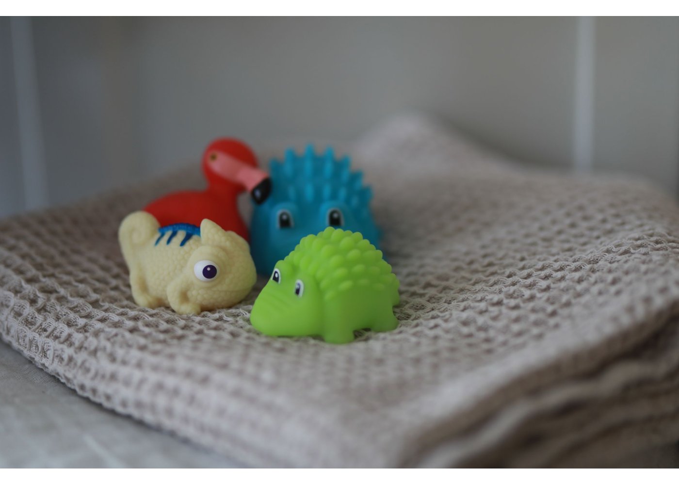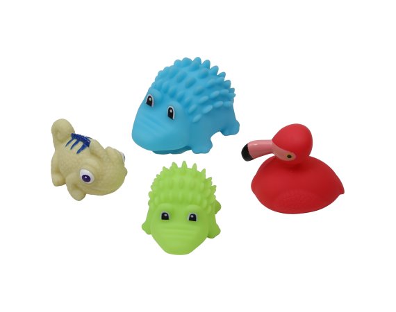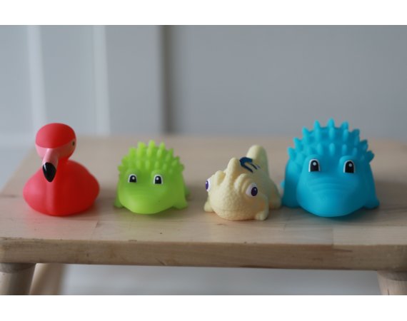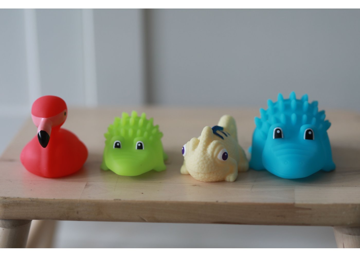 Settet består av 4 morsomme eksotiske dyr uten hull, noe som sikrer en lekeopplevelse uten risiko for muggdannelse!