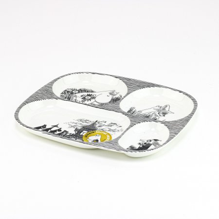 Vackert rumdelad tallrik i den fina designen Graphic från MuminTallrik i vita och svarta nyanser med Muminfigurer och kan användas till alla måltider.