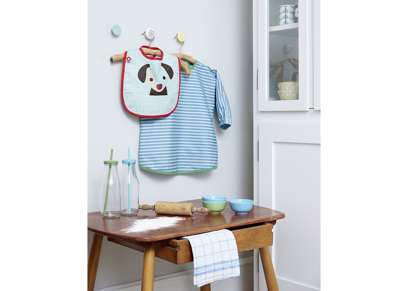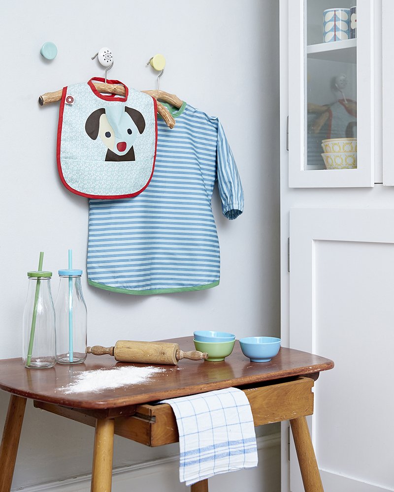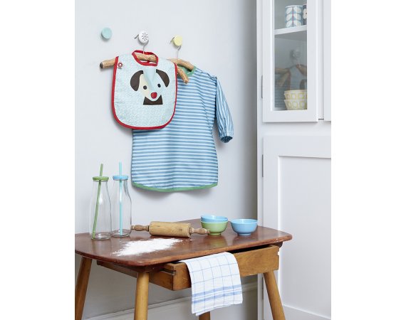 Förklädet är belagt med en tunn akrylbeläggning som gör det smutsavvisande. Det har kardborreknäppning så att ditt barn enkelt kan ta det av och på.