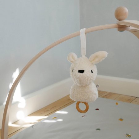 Den kan hängas upp var som helst där det finns lite ledig plats. Den kan hängas vid skötbordet, lekhagen, sängen, bilen eller kanske i barnvagnen.