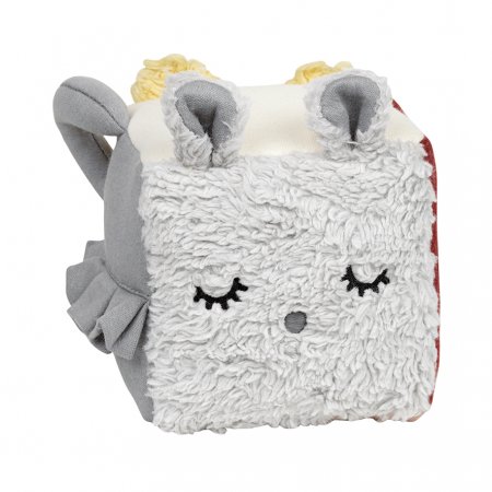 Fryd är en trevlig aktivitetstärning med många roliga aktiviteter.Tärningen har en sida med en gul nallebjörn, en sida med en grå kanin, en sida med volanger, en sida med handtag och allt i en vacker och mjuk ekologisk bomullsjersey. En annorlunda och söt aktivitetsleksak med massor av lekvärde.