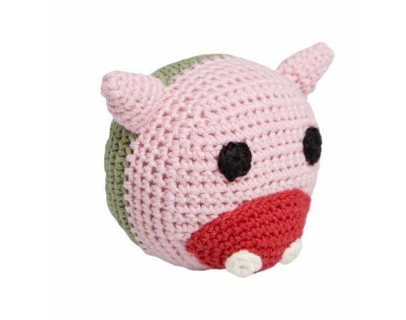 Fin virkad bollskallra från Franck & FischerEn jättefin skallra med gulligt grishuvud och i en bra storlek så att ditt barn kan gripa fatt om bollen.