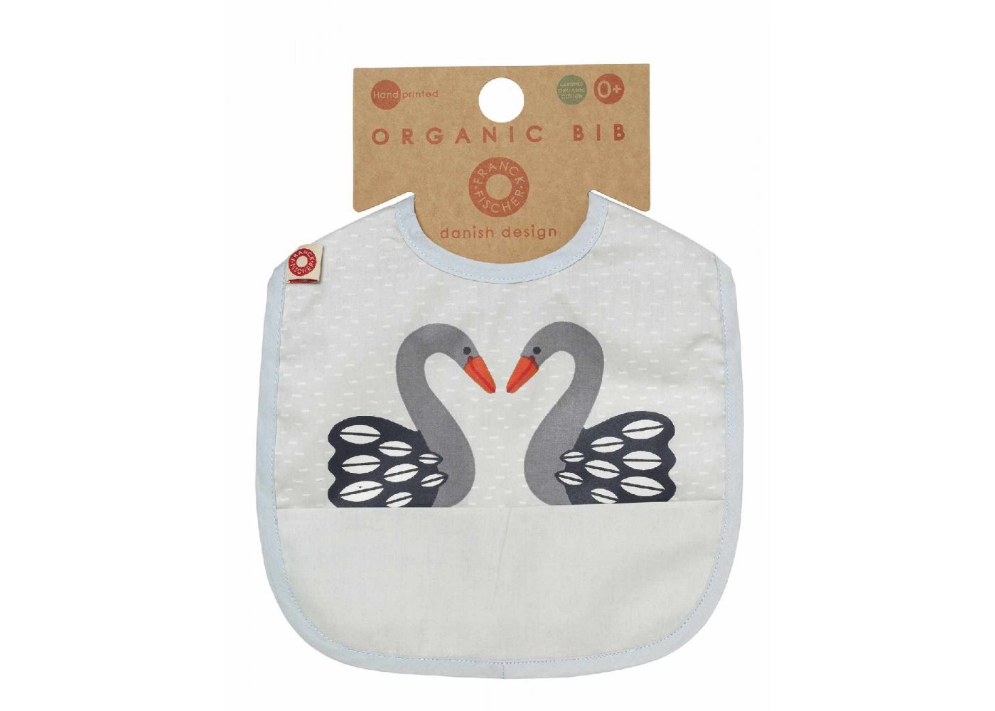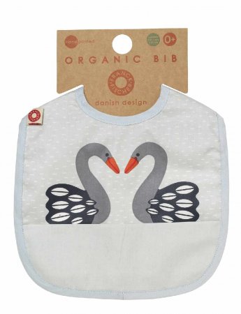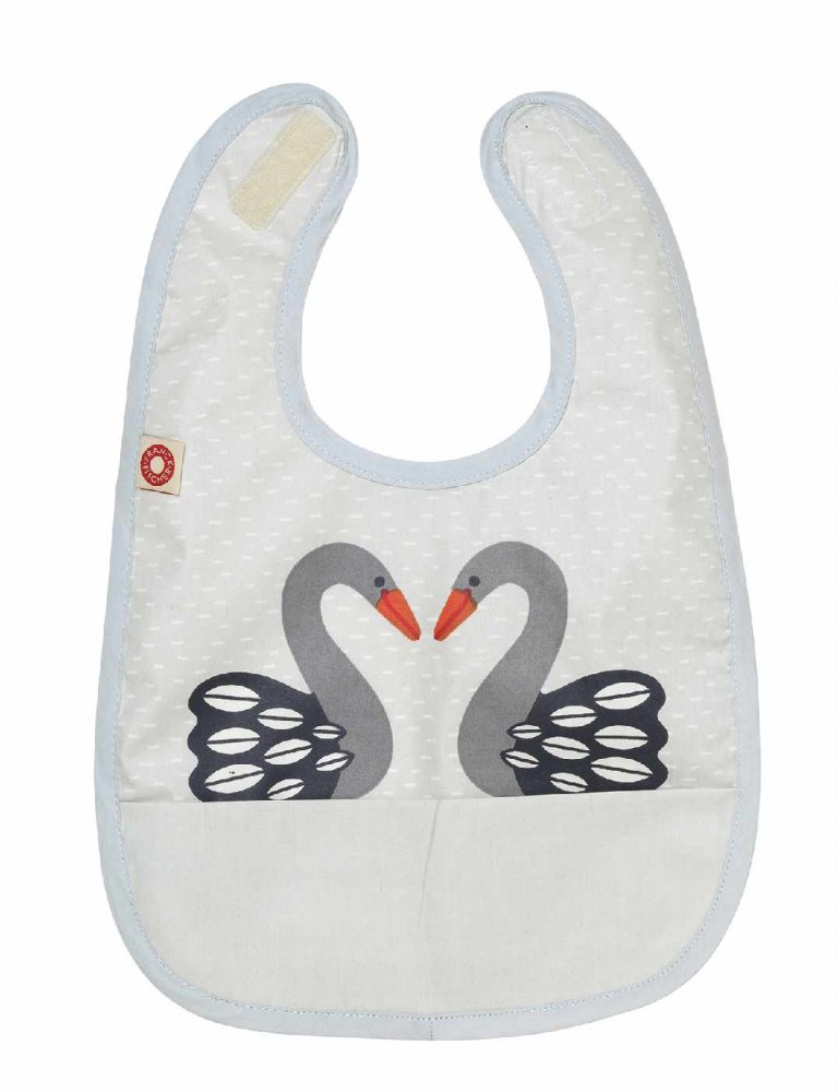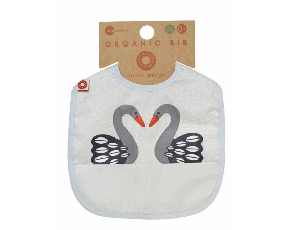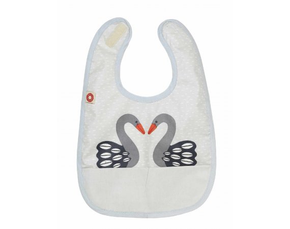 Haklapp med grå svanar från Franck & FischerSupersöt och enkel haklapp i härlig ekologisk bomull. Haklappen är behandlad med en tunn akrylbeläggning som gör den smutsavvisande. Dessutom har den en ficka som kan fånga upp lite av den mjölk och mat som spills.