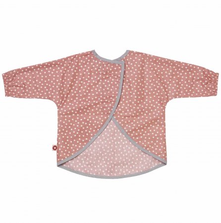 Förklädet är behandlat med en tunn akrylbeläggning som gör att det är smutsavvisande. Det har kardborreknäppning, så att barnet lätt kan ta det på och av.