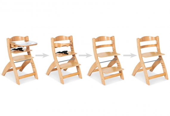 Stolens sæde og fodbræt kan indstilles i fem højder. Når barnet vokser fjernes bøjlen og stolen kan anvendes til barnet er i puberteten.