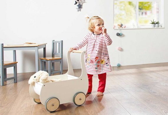 Dukkevognen er rummelig og kan fint køre rundt med både legetøj og dukker, når det er tid til at gå på eventyr.