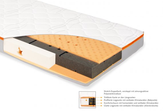 Den højkvalitets, punktelastiske 3-lags madraskerne lavet af PU-komfortskum sikrer optimal søvn til din baby takket være vandrette og lodrette klimakanaler. Klimaområdet på betrækket gør det muligt at transportere fugt ud endnu bedre. Takket være de robuste kanter på langsidene er dit barn beskyttet under de første forsøg på at stå. Den profilerede side kan bruges i starten til den lille baby.
