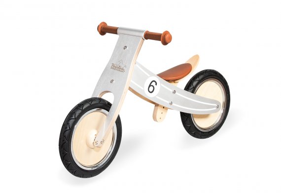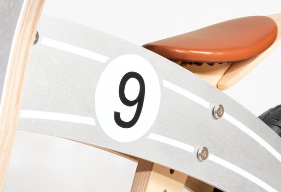 Løbecyklen Nico er i flot grå farve med hvide striber og tal på siden. Hjul, sæde og håndtag er brune.