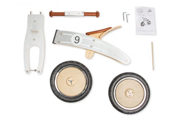 Balance cyklens træ-stel kan vendes på to måder, så de helt små børn kan komme op på cyklen uden hjælp. Cyklens saddel kan indstilles i otte forskellige højder.