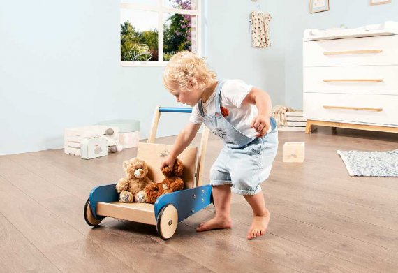 Barnet får en god støtte at læne sig op ad, når det skal lære balancegang. Da gå-vognen er udstyret med et lad, er det muligt at have krammedyret med på tur.