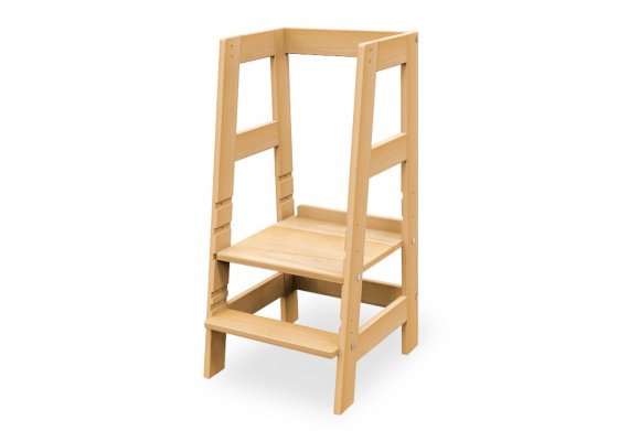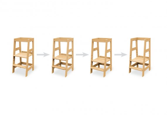 Pinolino lärningstorn kan ställas in i tre höjder, säkerhetsbrädan på baksidan kan tas bort och möbeln förvandlas till en stegpall. Lärningstornet är tillverkat av massivt, obehandlat, massivt bokträ och är byggt med säkerhet i åtanke.