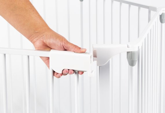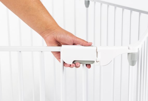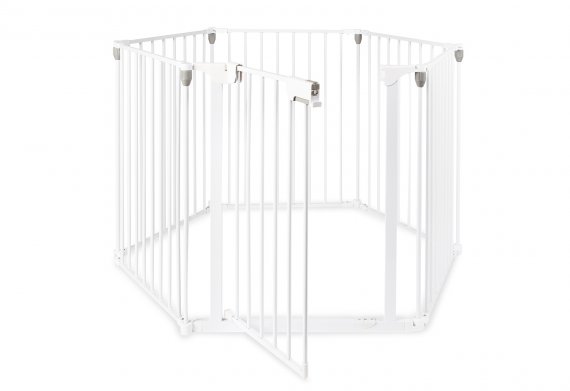 Dimensioner: L 120 cm, B 120 cm - som beskyttelsesgitter L 373 cm, H 75 cm Hver af de 6 sider er 60 cm brede Hvidlakeret metal og grå kunststof Bundmadras i 70% polyester og 30% bomuld Fyld af 100% polyester 11 dele: 5 gitre, 1 dør, 4 samleelementer og 1 bundmadras Dørelement kan åbnes til begge sider med et 2 grebs sikkerhedssystem Kan forlænges med yderligere Vario sikkerhedsgitre Samlevejledning medfølger