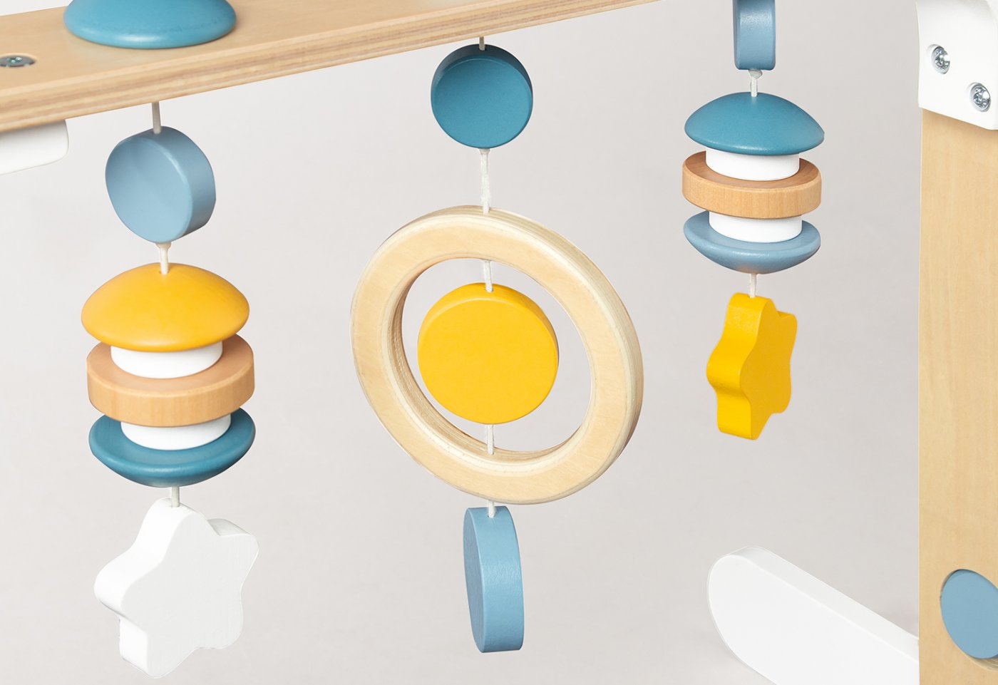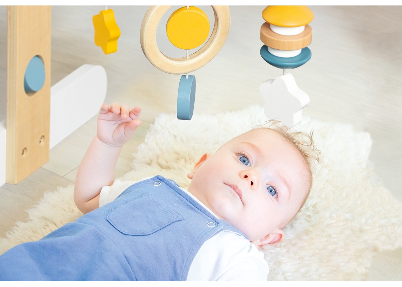 Ett babygym kan användas på aktivitetsfilten, i lekhagen, på golvpusslet och naturligtvis också bra att ha med sig när man åker till stan.