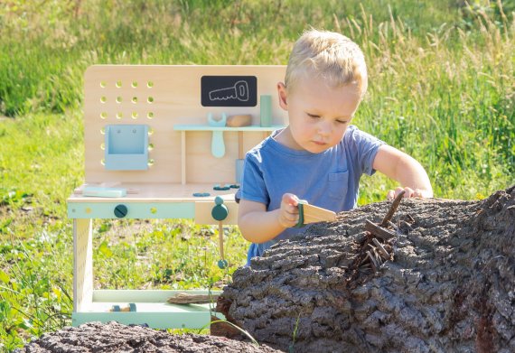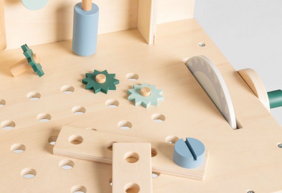 Här får du en robust och spännande verktygsbänk som kan lära både pojkar och tjejer sitt första hantverk på ett lekfullt sätt. Verktygsbänken har en cirkelsåg med klickljud, centimetermått på bordsskivan och massor av hål där skruvar och muttrar kan skruvas in. Den är så cool! Med sin skandinaviska färgdesign kan verktygsbänken passa in i vilken heminredning som helst. Naturligtvis är den också perfekt att ta med sig ut i bra väder.