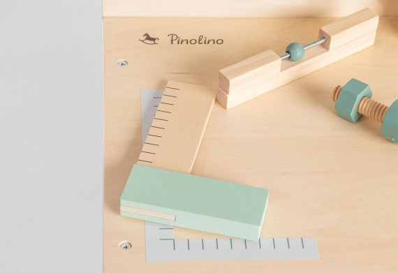 Superfin och cool verktygsbänk i skandinavisk design från Pinolino med cirkelsåg, skruvstäd och liten krittavla.
