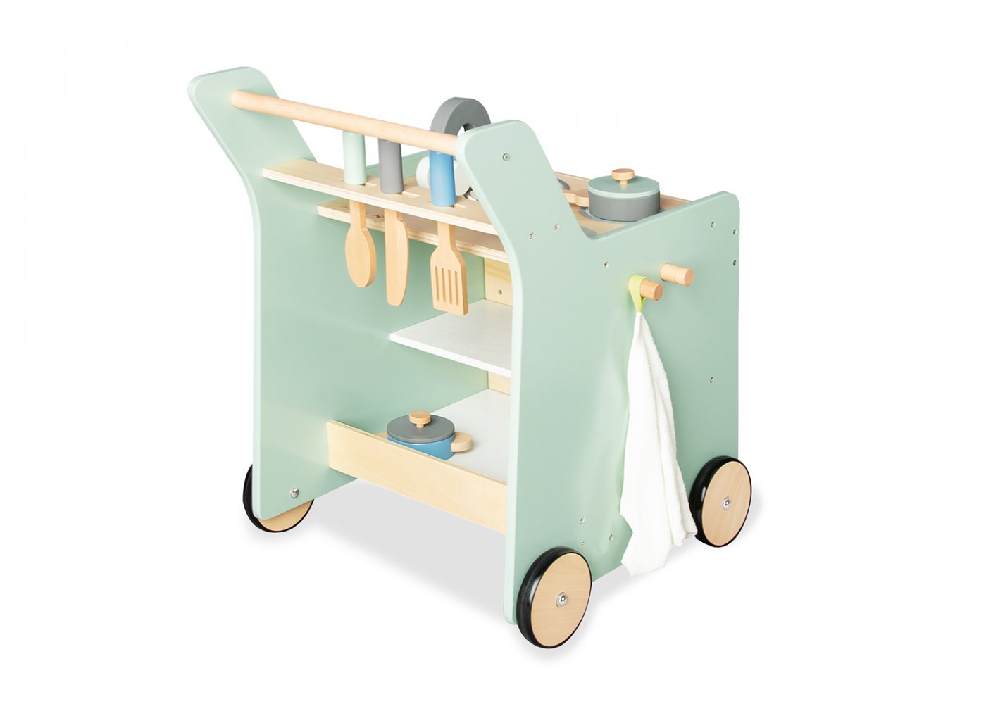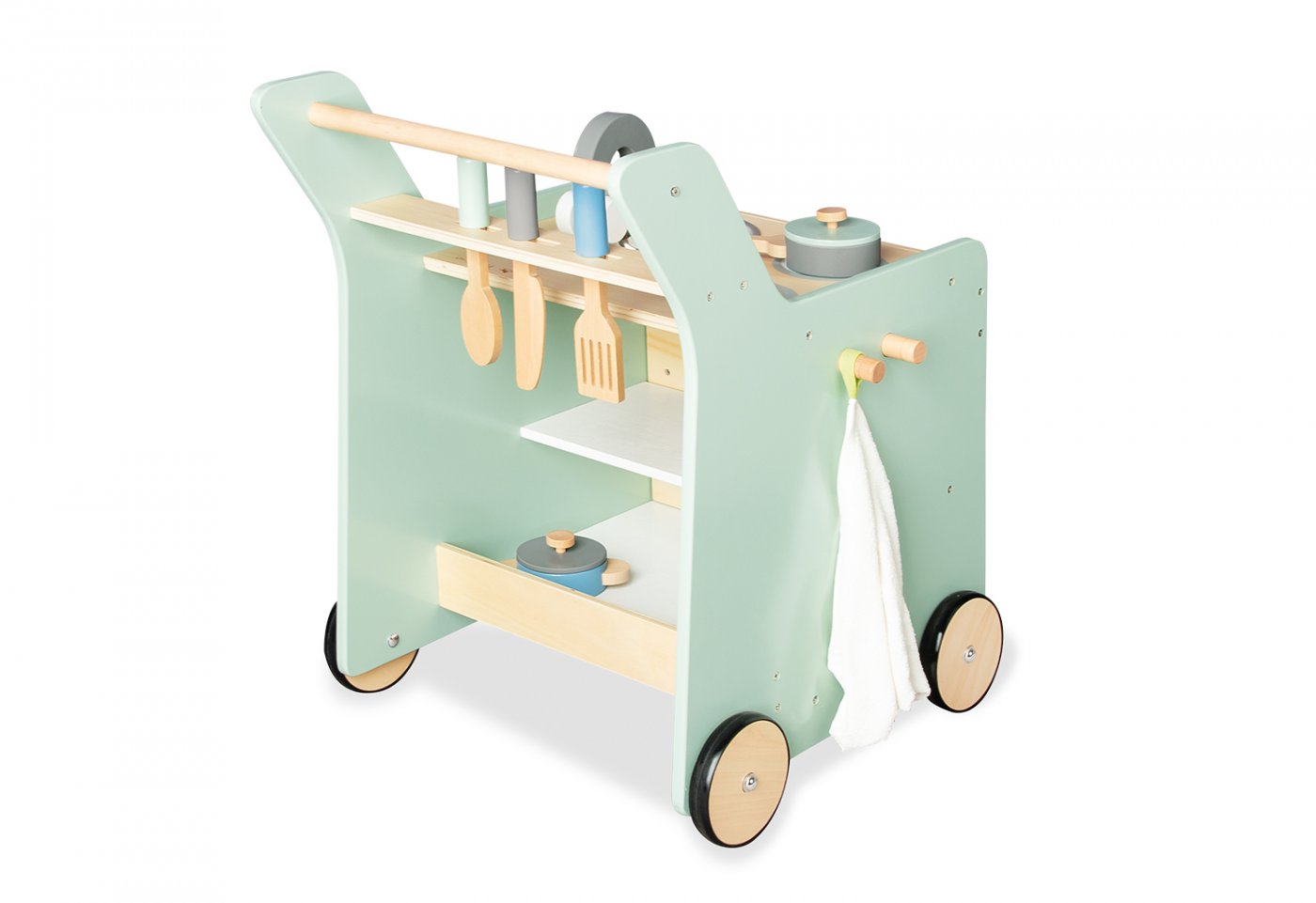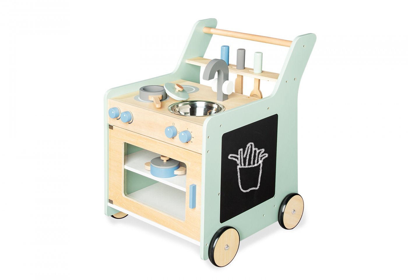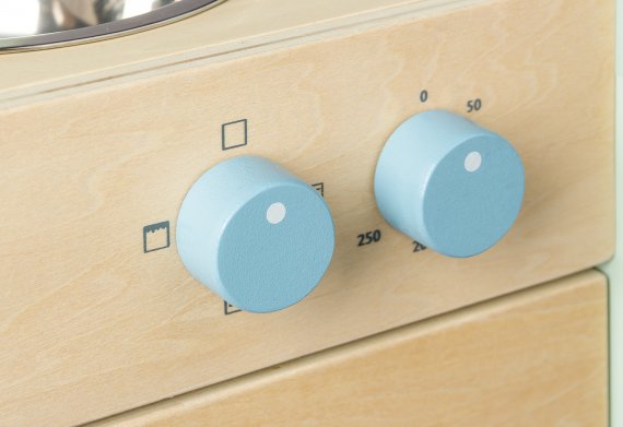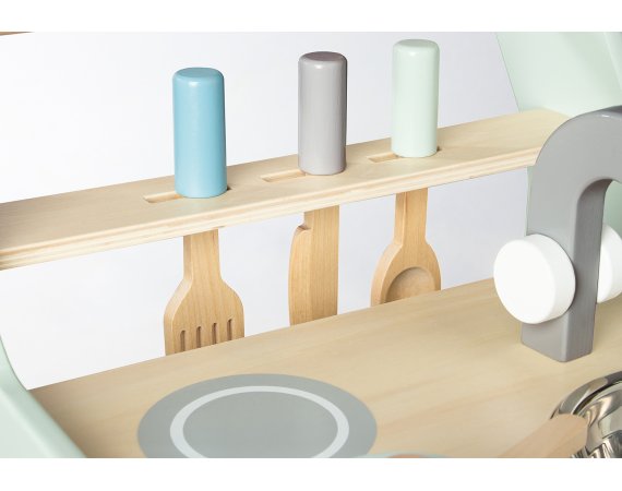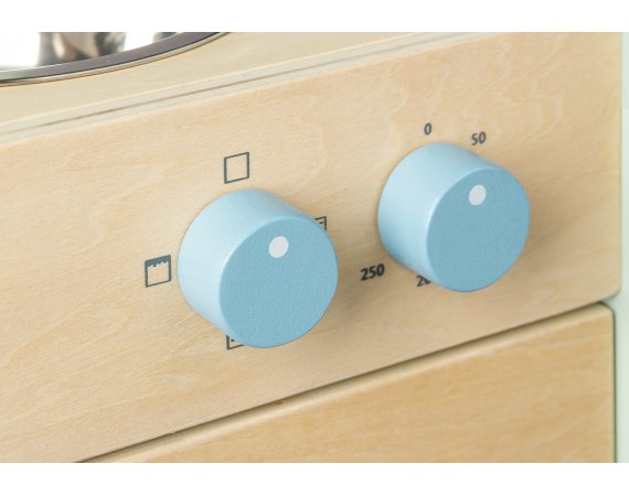 Om det någon gång blir tråkigt att laga mat kan köksredskap läggas i rummet under kokplattorna och barnet kan måla på krittavlan som är på sidan. De gummerade trähjulen gör att köket kan skjutas tyst och försiktigt runt.