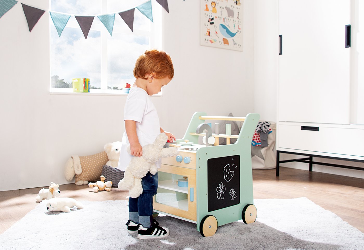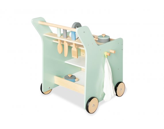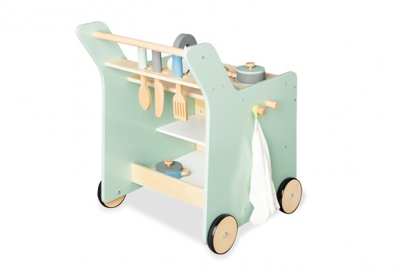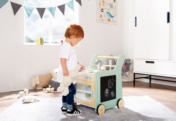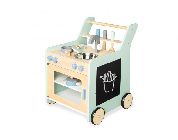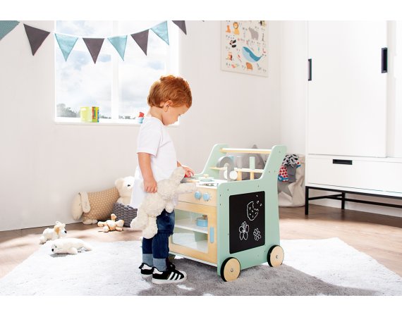 Köket fungerar både som gåvagn och lekkök, så den lilla stjärnkocken kan steka ägg och tvätta sig efter en kort promenad.