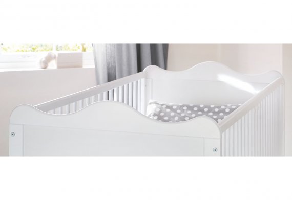 Florentina är en kombisäng med liggmått som är större än en vanlig babysäng. Den kan därför växa med ditt barn. Sängen är elegant med runda spjälor och slutna gavlar.