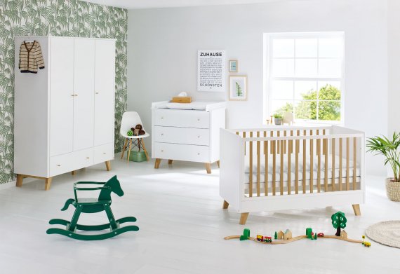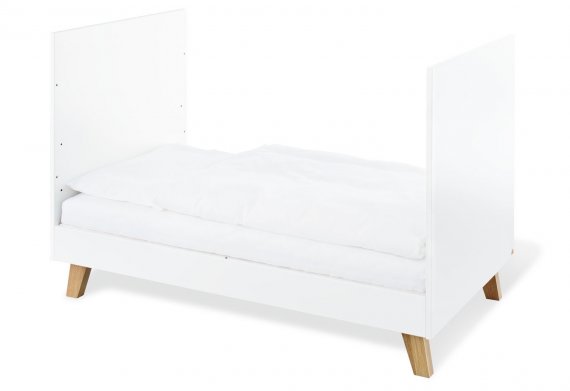 Sängens liggmått är större än en vanlig barnsäng och sängen kan därför växa med ditt barn. Pinolino-babysängen är vit färg med tunna, platta sojälor i trä längs sidorna. En kombination som ger en fantastiskt snygg look. Sängens lamellbotten kan justeras i tre olika höjder.