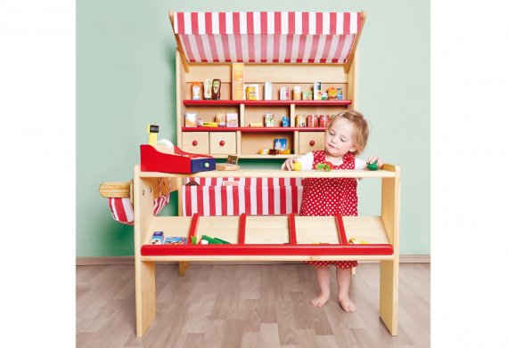 En livsmedelsaffär eller marknadsstånd är en leksak som stimulerar ditt barns fantasi och kreativitet.