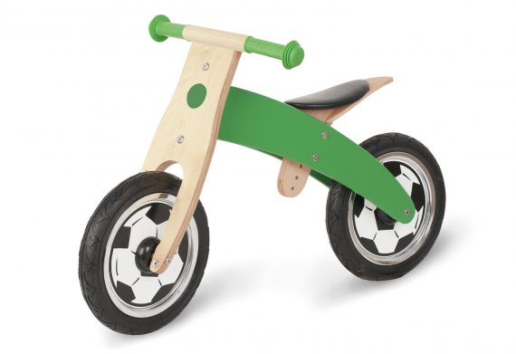Springcykeln Jogi har en fin grön färg och hjulen har reflexer och tryck så de ser ut som en fotboll.