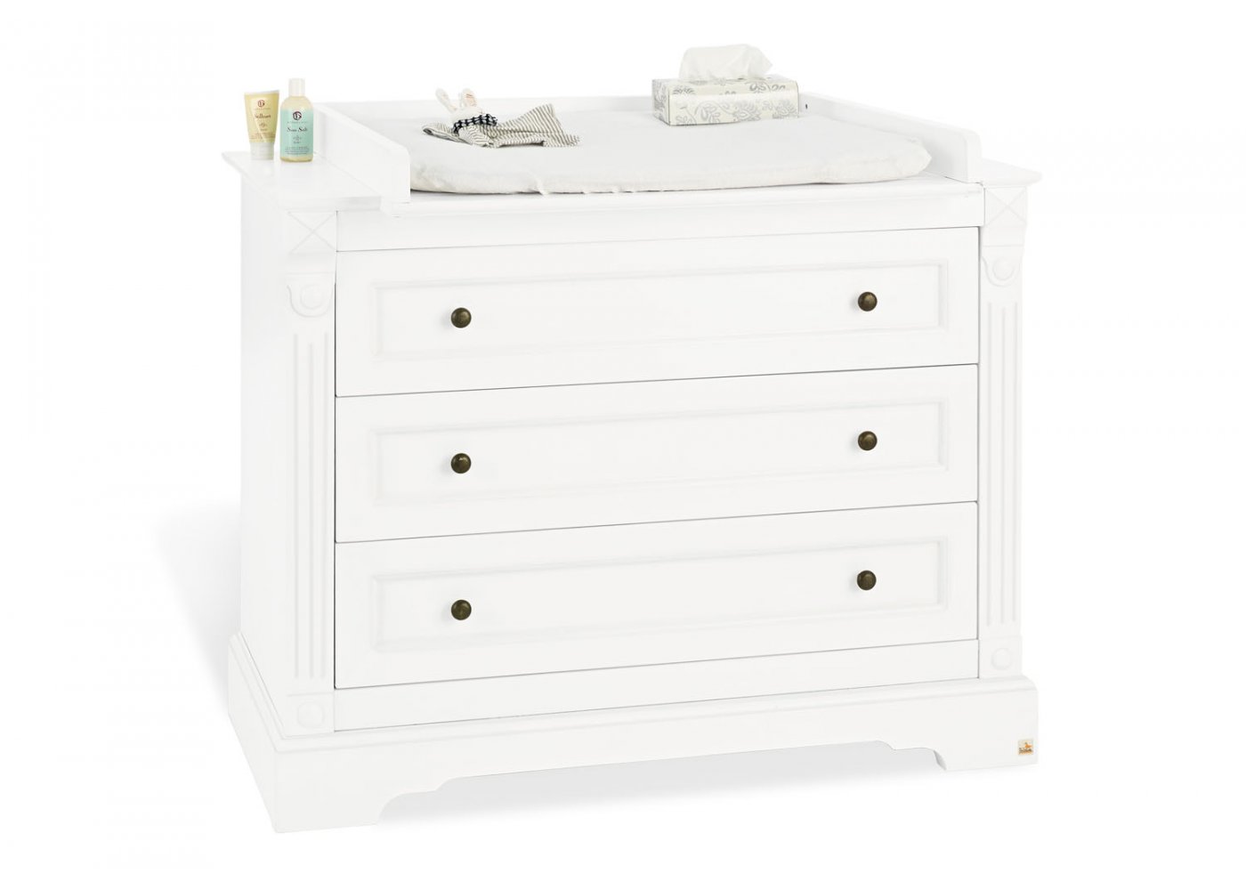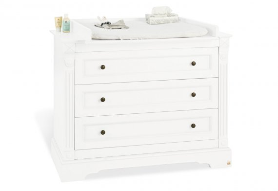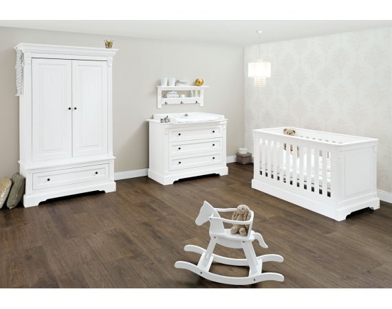 Emilia kombisäng, bred skötbyrå och tvådörrars garderob från PinolinoBarnrumsserien EMILIA har en snygg barockstil med fina detaljer. Det är perfekt för familjer som tycker om en majestätisk och robust stil.