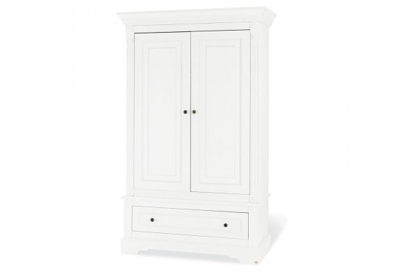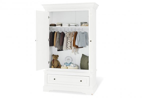 Garderoben Emilia är inte uppdelad. Garderoben har ett stort utrymme med justerbar hylla och klädstång. Längst ner finns en låda för både kläder och leksaker.