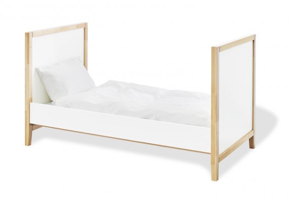 När ditt barn blir större kan spjälsidorna tas av och de två medföljande sidopanelerna kan monteras så har du en fin juniorsäng.