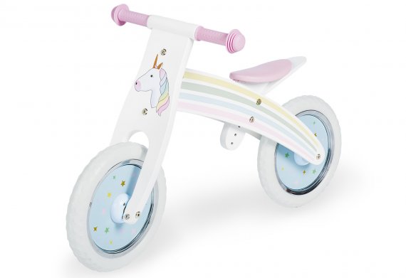 Supergullig springcykel från Pinolino med stjärntryck, klistermärken med enhörningar och regnbågar att pynta cykeln med.Balanscykelns träram kan vändas på två sätt så att de minsta barnen kommer upp på cykeln utan hjälp. Cykeln är tillverkad av massiv björk.