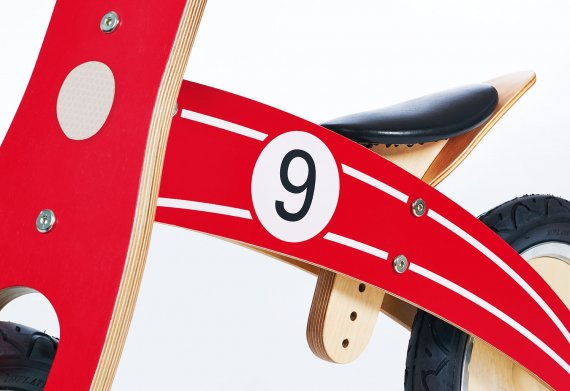 Balanscykelns träram kan vändas på två sätt så att de minsta barnen kommer upp på cykeln utan hjälp. Cykelsadeln kan justeras i åtta olika höjder.