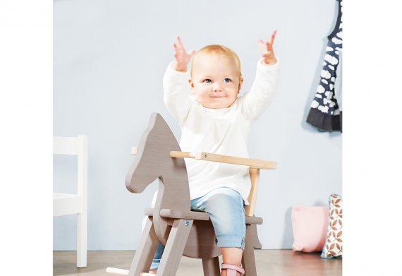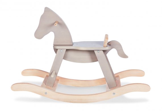 Gunghäst Pinolino i massiv obehandlad bok och delvist målad i grå färgGunghästen är en klassiker som aldrig går ur mode.