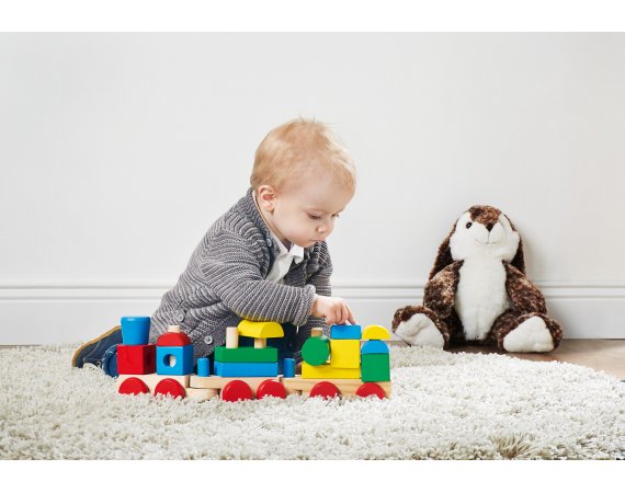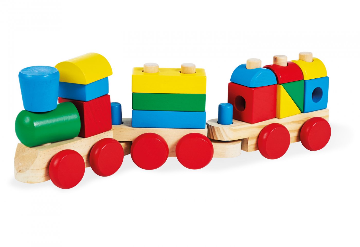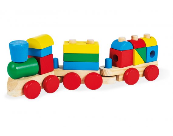 Pinolino tåg i trä, MollyStort, roligt och kreativt tg som byter utseende beroende på vem som leker med det. Tågets vagnar består nämligen av klossar i olika färger som man kan byta om på och som sätts på tågets och vagnarnas pinnar i slumpmässig ordning. Klossarna är gjorda i roliga former så man kombinera dem på många olika sätt.