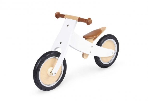 Løbecyklen Johan er i flot hvid farve. Hjul, sæde og håndtag er sorte.