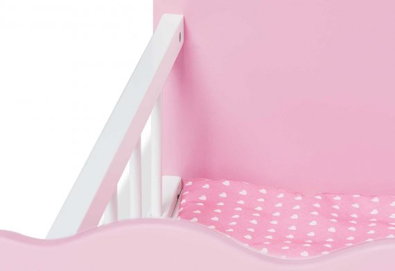Dukkesengen leveres med sødt sengeudstyr i lyserødt og med hjerter.