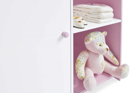 Skötbyrån har ett skåp och en hylla, så det finns utrymme att lägga dockkläder och skötutrustning.