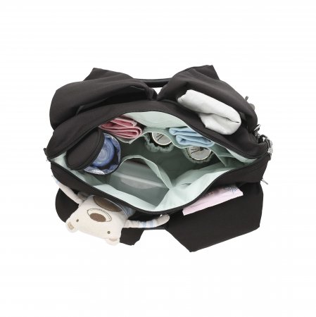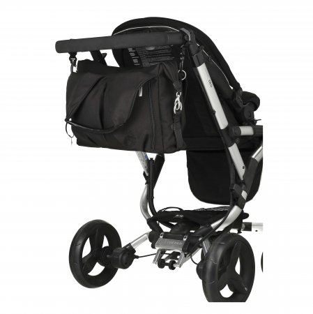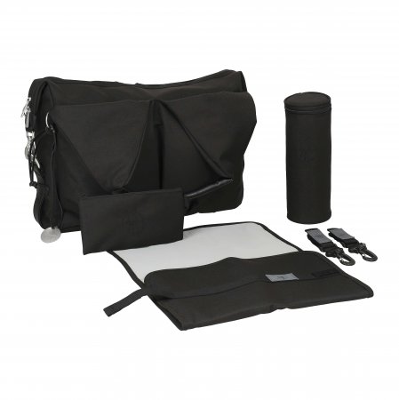 Skötväskan levereras med en isolerande flaskhållare, ett tvättbart skötunderlägg, två barnvagnsremmar, en justerbar axelrem så att väskan även kan hänga på styret samt en liten necessär. Skötväskan har fasta korta remmar.
