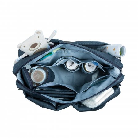 Skötväskan levereras med en isolerande flaskhållare, ett tvättbart skötunderlägg, två barnvagnsremmar, en justerbar axelrem så att väskan även kan hänga på styret samt en liten necessär. Skötväskan har fasta korta remmar.