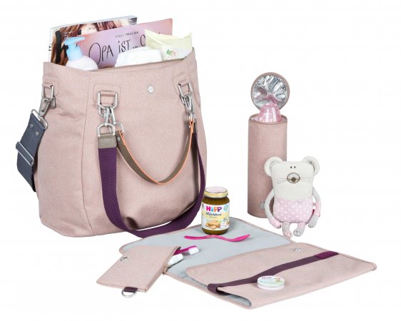 Med skötväskan medföljer ett tvättbart skötunderlägg, två barnvagnsremmar, en justerbar axelrem så att väskan även kan hängas på barnvagnsstyret, en nyckelbricka samt isolerande flaskhållare och en liten necessär.