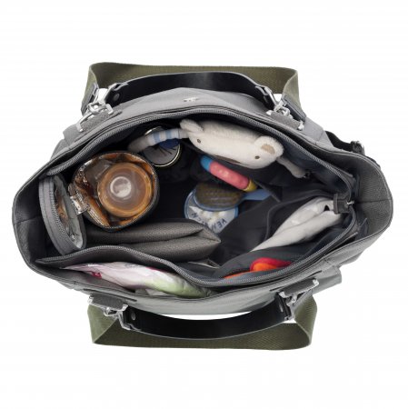 Väskan har två stora öppna fickor där den största fickan har flera praktiska fickor som gör det snabbt och lätt att hitta blöjorna och andra tillbehör. Facket kan stängas med en dragkedja.