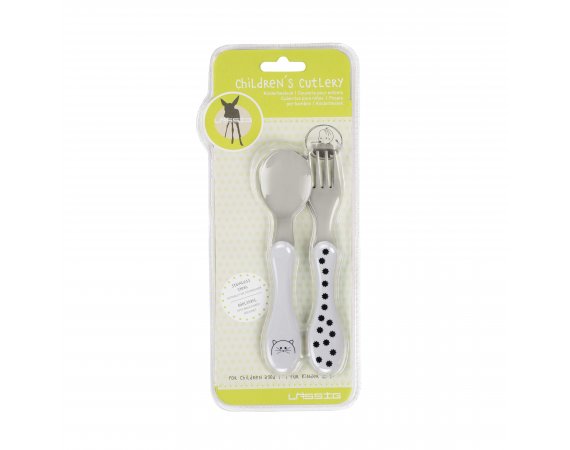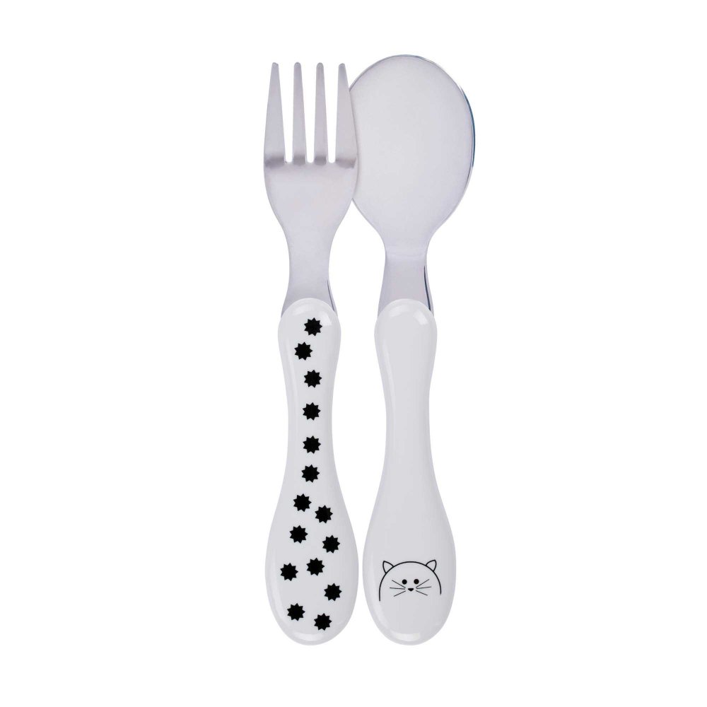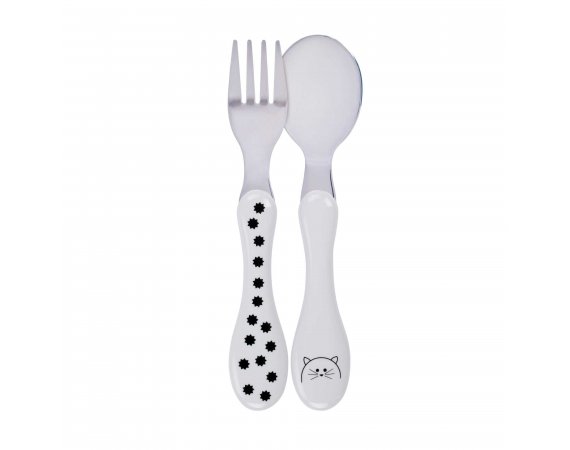 Lässig barnbestick från serien Little Chums CatBarnbestick i vit färg med prickar och motiv av en tecknad katt.