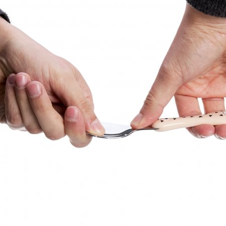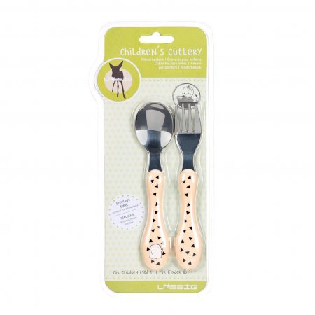 Setet består av en sked och gaffel. Både sked och gaffel har ett bra ergonomiskt grepp för små händer.