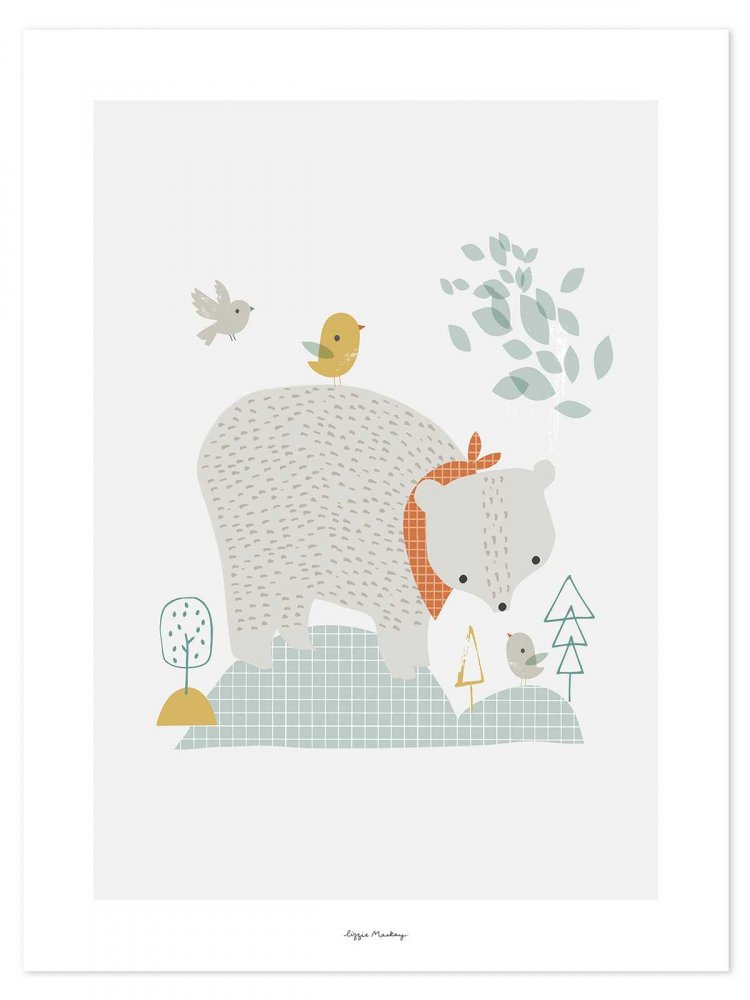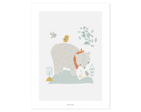 Affisch från LilipinsoFin naivistisk affisch med björn och fåglar i naturen att dekorera barnrummet med. En dekoration som både kan hängas på väggen eller stå på en hylla och bidra till stämningen.