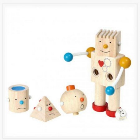 Robot med olika huvudenLek med roboten som har fyra olika huvuden. Ditt barn kan sätta ett glatt eller surt huvud på roboten. Ett fint sätt att uttrycka olika känslor på. Roboten kan både sitta och stå.