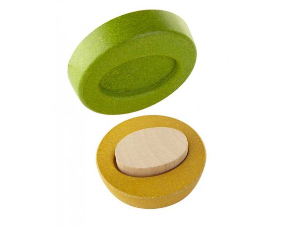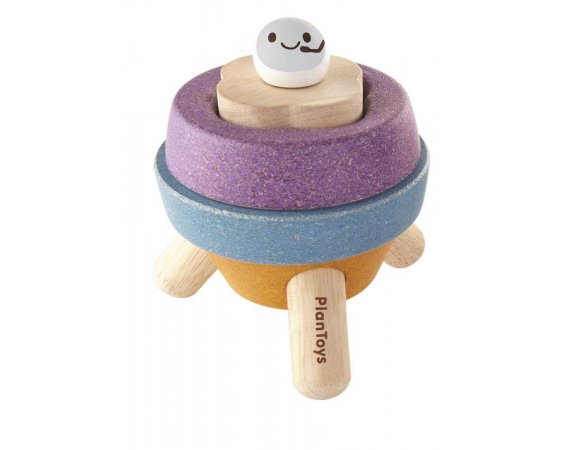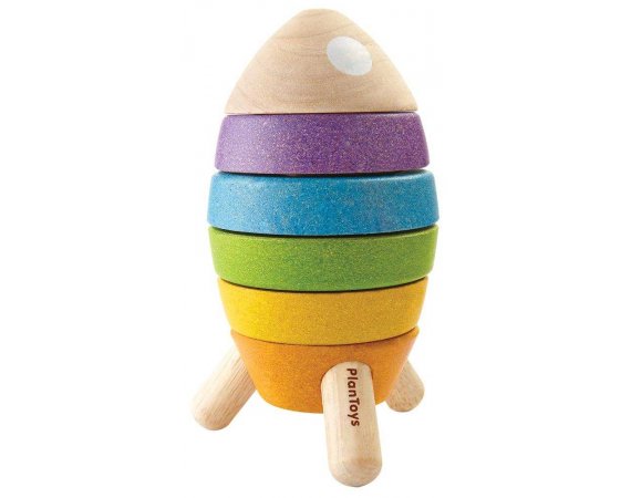 Det annorlunda stapelraketen levereras med 4 färgglada träringar i olika storlekar samt en cockpit upptill som håller fast träringarna i tornet.