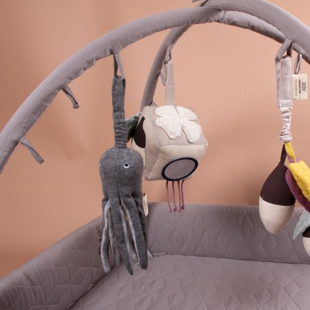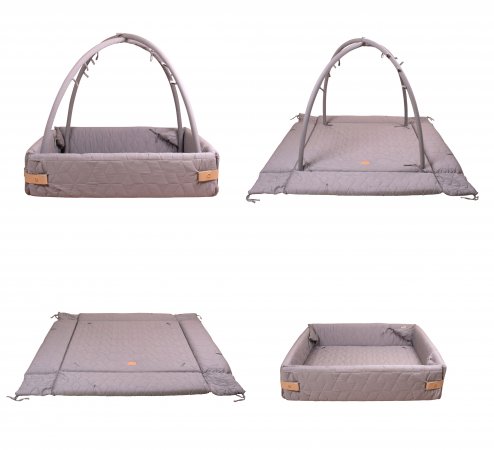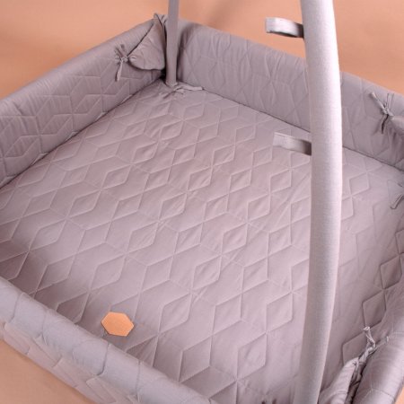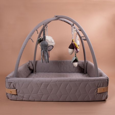 Skön aktivitetsfilt med höga sidor.Filten har många användningsområden och kan användas som lekhage, babynest, aktivitets- och lekmatta. Aktivitetsnestet stängs med ett läderspänne som du klickar på med en tryckknapp. Filten levereras också med en aktivitetsbygel att hänga leksaker på.