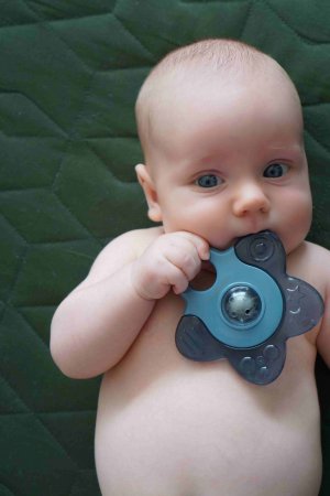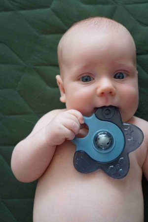 Cooling star är en söt kylstjärna med olika taktila detaljer i dammigt blå/gröna färger för att lindra ömt tandkött.Under den tid då tandköttet är särskilt ömt kan du bara ge barnet en bitring åt gången och lämna den andra i kylen. På detta sätt får barnet lindrande över en längre tid. Bitringen är lämplig för kylning i ett vanligt kylskåp.