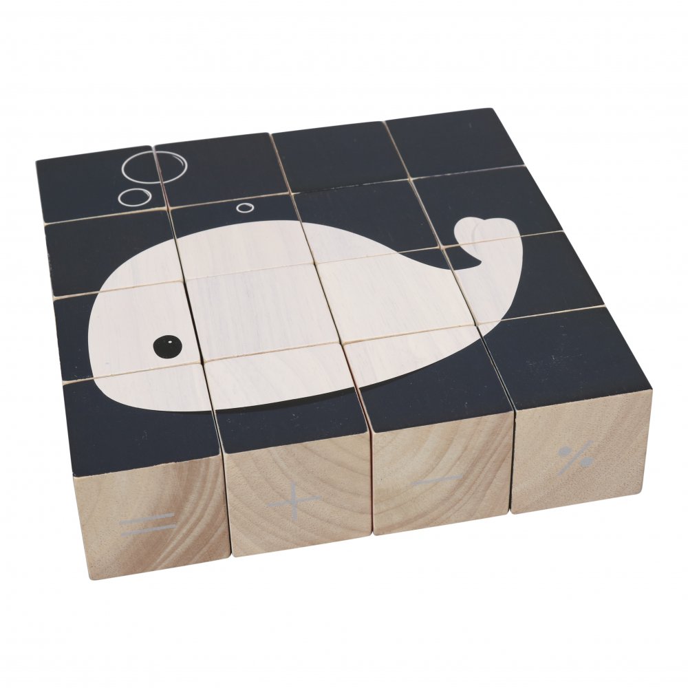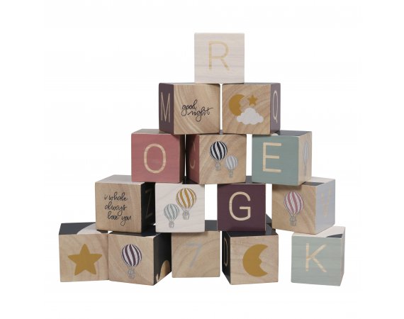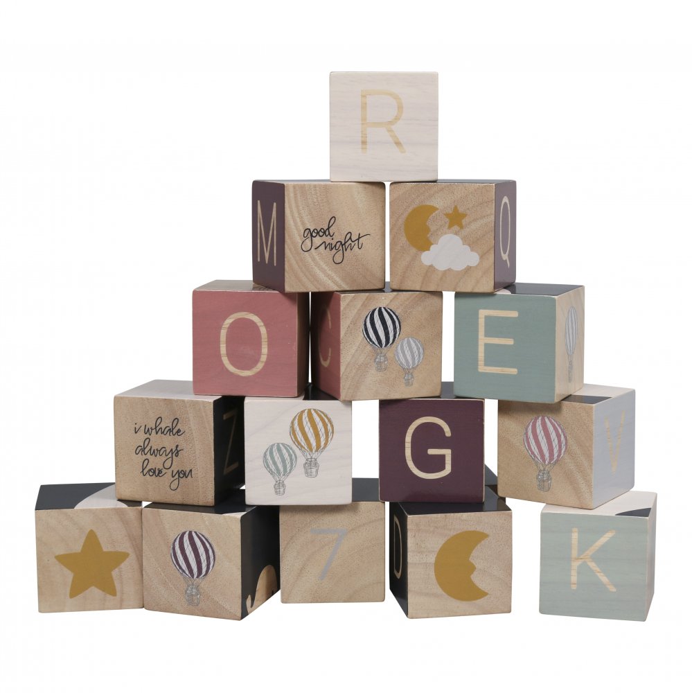 Sköna massiva träklossar från FilibabbaSetet består av 16 klossar med alfabet, siffror från 1-10, luftballonger, stjärnor, månar och mycket mer. Sist men inte minst är det möjligt att samla en val och luftballonger. Sammantaget en pedagogisk leksak.