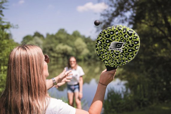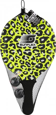 Jerseypren (våtdräktsmaterial) strandracketset i limegrönt, svart och vitt med djurmönster från Sunflex.