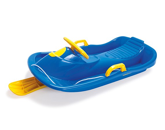 Här får du en stabil och stark styrkälke med bred sits, ratt och bromsar. Släden har dragsko och handtag, så den är lätt att dra efter sig, eller lyfta uppför backen innan det går ner igen i rasande fart.