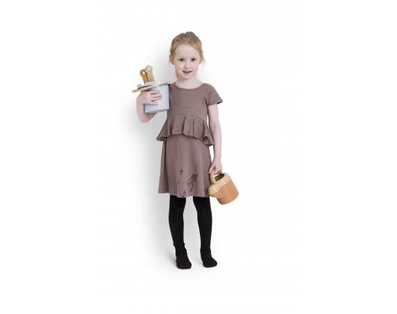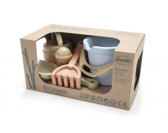 Härligt strandset i BIOplast från DantoySetet består av en hink, en kratta, en spade och en vattenkanna. Allt man behöver för att ha det kul i sandlådan eller på stranden under sommaren.